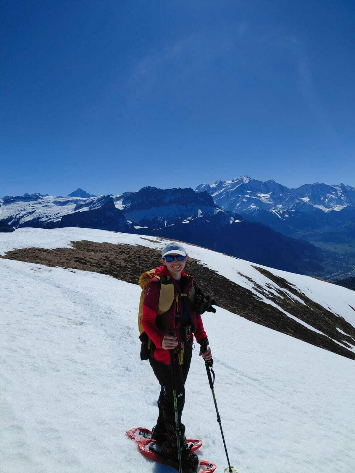 Derrière Aurélie, le Désert de Platé, les Aiguilles Rouges et le Massif du Mont Blanc